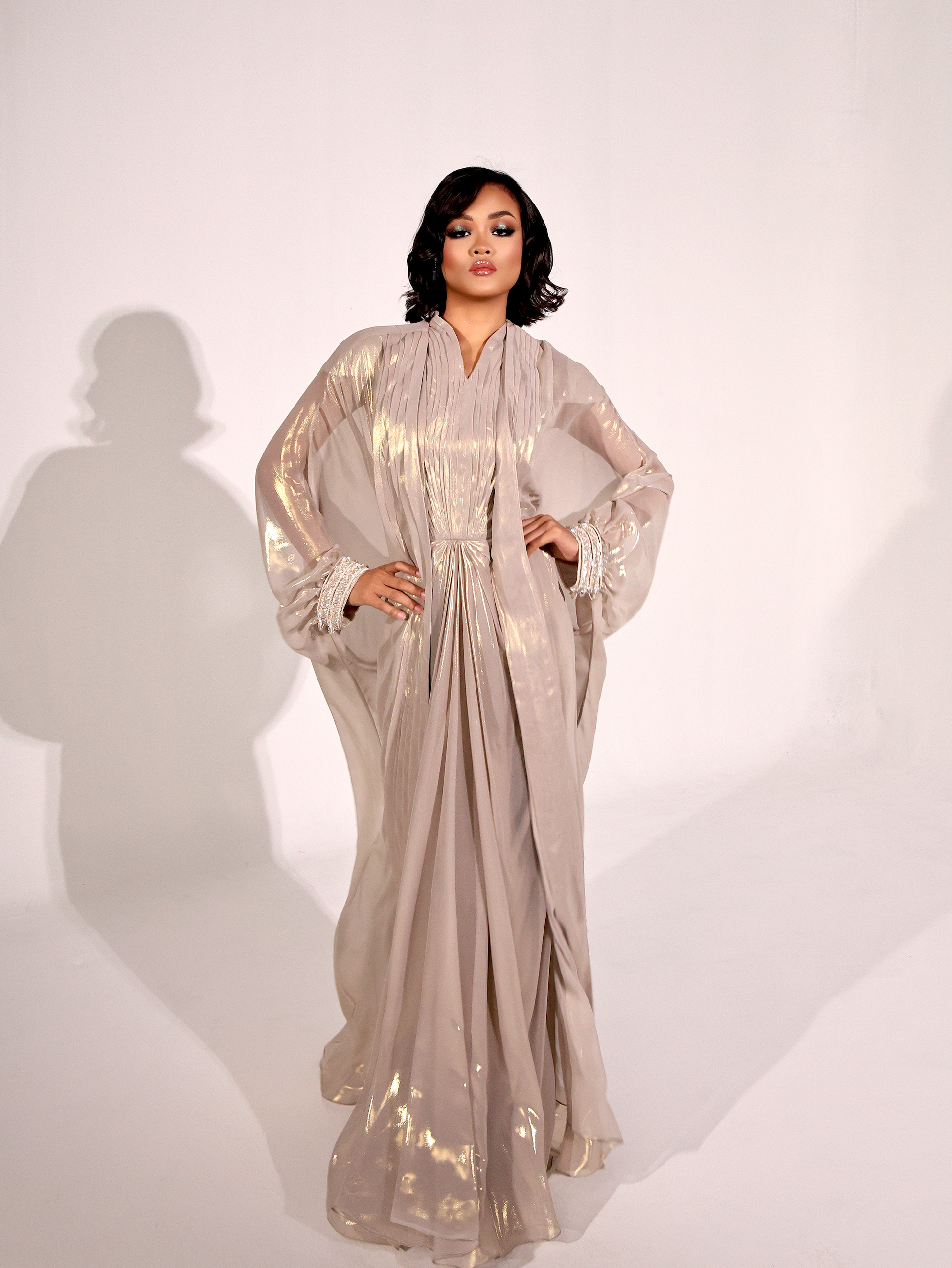 This flowing gown is crafted from lightweight metallic chiffon with a soft, luminous finish. Designed with a cinched waist and graceful draping through the front, it creates a flattering silhouette that moves beautifully with every step. The fluid cape add drama and elegance while maintaining a refined, effortless feel. It’s perfect for Ramadan evenings and special occasions.